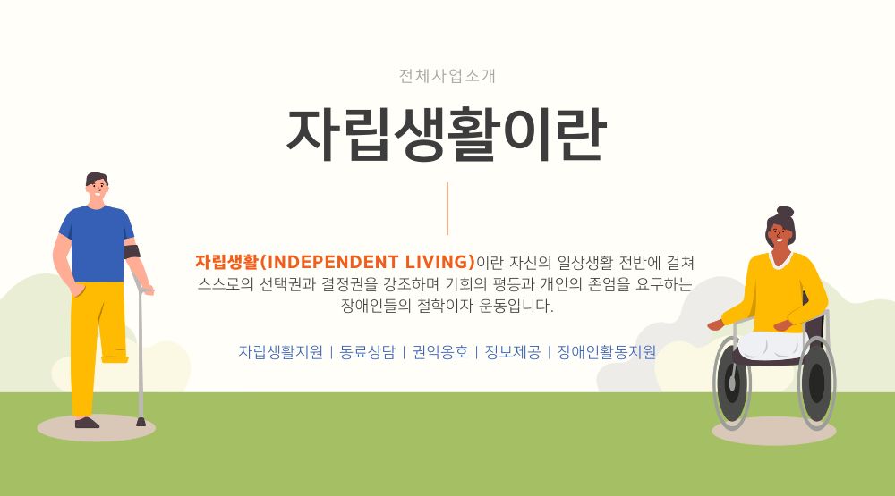 자립생활이란 일상생활의 모든 일을 다른 사람의 도움 없이 장애인 스스로 해결하는 것이 아니라, 매일의 삶을 우리 스스로 선택하고 통제할 수 있는 동등한 기회를 얻게 되는 것을 말합니다. 그리고 그 기회를 통해 자신의 생활에 대한 결정권을 가지며 자립생활에 대한 성공과 실패까지도 자신 스스로가 책임지는 것입니다.